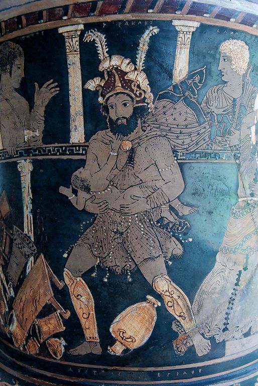 The Chorus sing a joyful song of celebration, but it is interrupted by the unexpected appearance of Iris (the messenger goddess) and Lyssa (the personification of Madness). Iris announces that she has come to make Heracles kill his own children by driving him mad (at the instigation of Hera, Zeus' jealous wife, who resents that Heracles was Zeus' son, as well as the god-like strength he has inherited).